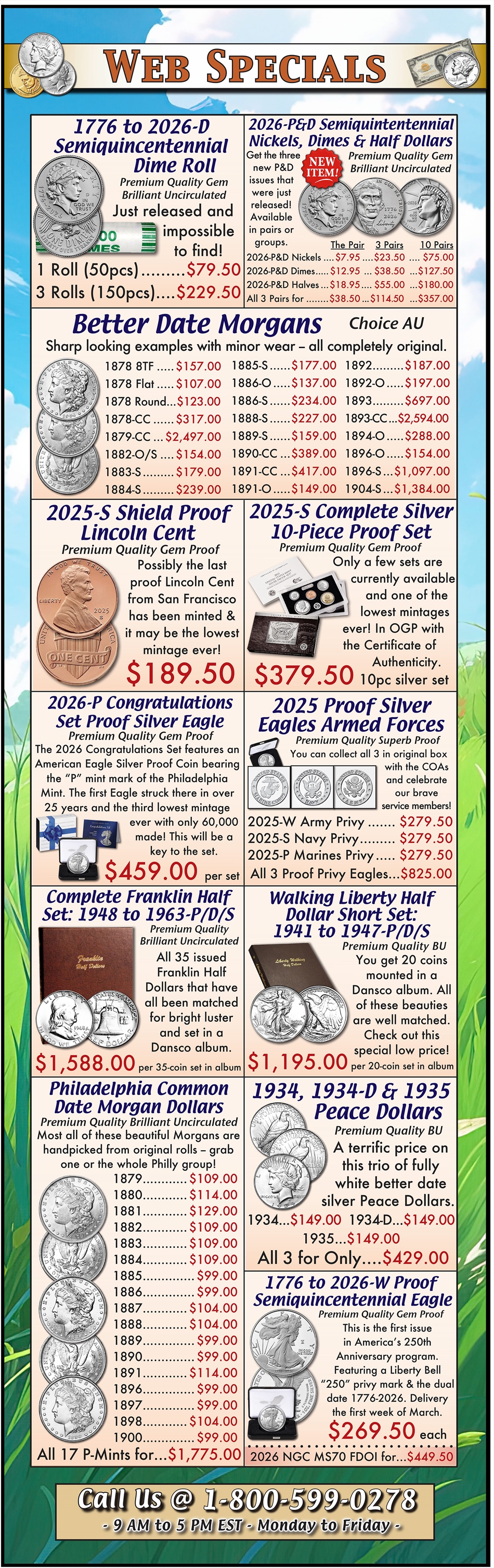 2025-S Proof Lincoln Cent 2025-S Complete Silver 10pc Proof Set Complete Franklin Half Dollar Set in Album - 35pcs Walking Liberty Half Dollar Set in Album - 20pcs 1934 Peace Dollar 1934-D Peace Dollar 1935 Peace Dollar 1934-P&D, 1935 Peace Dollars 1879 Morgan Dollar 1880 Morgan Dollar 1881 Morgan Dollar 1882 Morgan Dollar 1883 Morgan Dollar 1884 Morgan Dollar 1887 Morgan Dollar 1888 Morgan Dollar 1891 Morgan Dollar 1898 Morgan Dollar 1885 Morgan Dollar 1886 Morgan Dollar 1889 Morgan Dollar 1890 Morgan Dollar 1896 Morgan Dollar 1897 Morgan Dollar 1900 Morgan Dollar All (17) Philadelphia Common Date Morgan Dollars 1878 8TF AU Morgan Dollar 1878 Flat AU Morgan Dollar 1878 Round AU Morgan Dollar 1878-CC AU Morgan Dollar 1882-O/S AU Morgan Dollar 1883-S AU Morgan Dollar 1884-S AU Morgan Dollar 1885-S AU Morgan Dollar 1886-O AU Morgan Dollar 1886-S AU Morgan Dollar 1888-S AU Morgan Dollar 1889-S AU Morgan Dollar 1890-CC AU Morgan Dollar 1891-CC AU Morgan Dollar 1891-O AU Morgan Dollar 1896-O AU Morgan Dollar 1894-O AU Morgan Dollar 1893 AU Morgan Dollar 1892-O AU Morgan Dollar 1892 AU Morgan Dollar 1879-CC AU Morgan Dollar 1893-CC AU Morgan Dollar 1904-S AU Morgan Dollar 1896-S AU Morgan Dollar